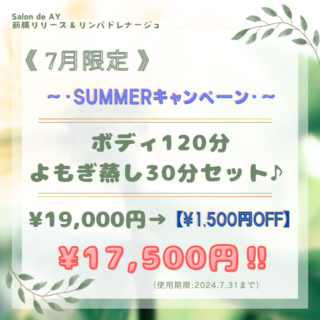 夏の暑さが本格的になるこの時期にこそ、よもぎ蒸しが特におすすめです❣️✨冷房の効いた室内や冷たい飲み物が増えることで、知らず知らずのうちに体内から冷えてしまうので『筋膜リリース✖︎よもぎ蒸し』で身体の内側から温めましょう✨💪