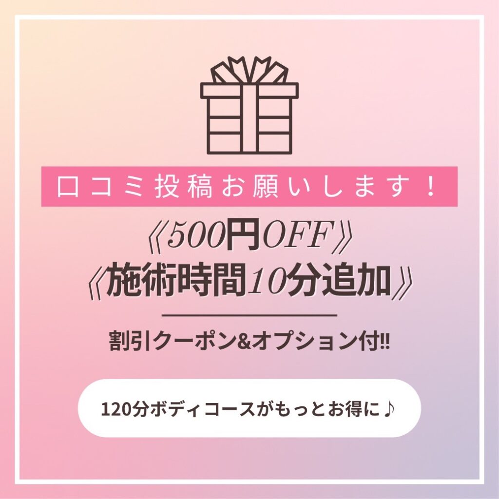 💗本日はNEWクーポンのお知らせです💗度々、お願いさせて頂いている口コミ投稿なのですが、更にお得なサービスを追加致しました❣️
