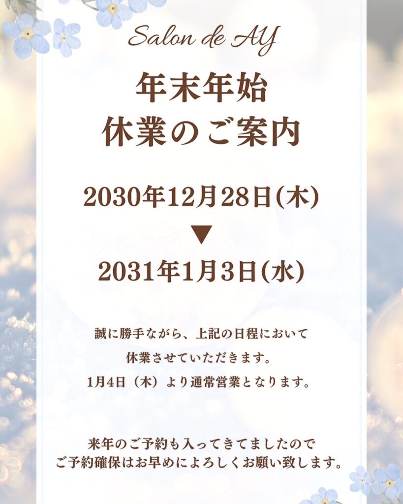 年末年始は大変ご予約が埋まりやすくなりますので、ご予定やご都合に合わせて、早めのご予約をお願い致します🙇♀️💗