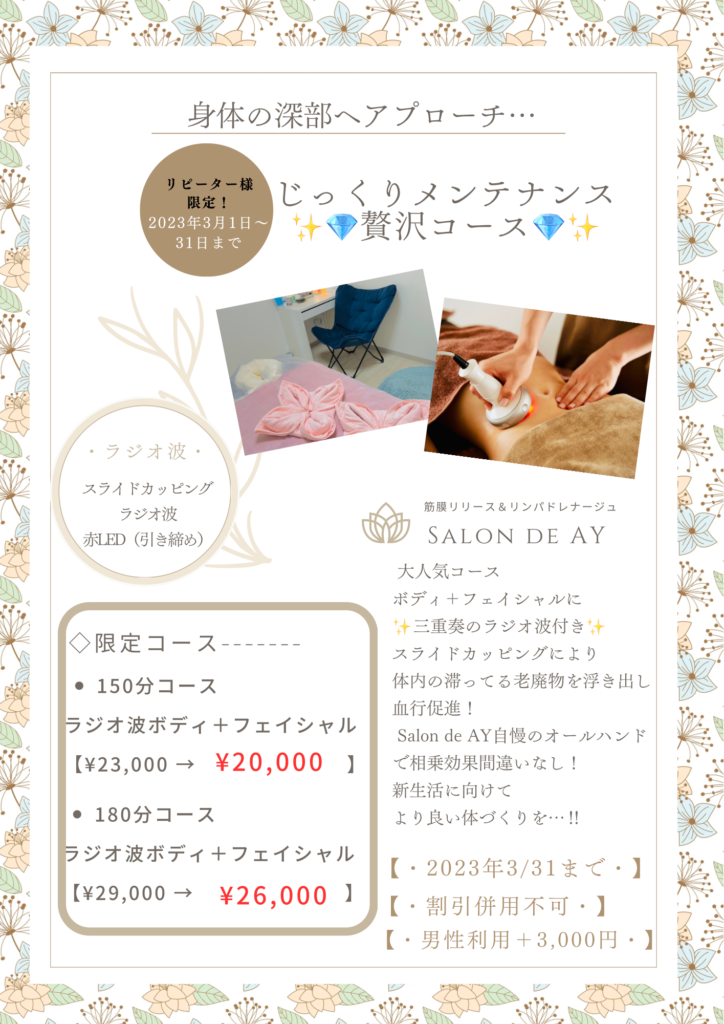 🌸3月のお得なクーポン🌸はそんな大人気の『✨ボディ+フェイシャル✨』コースに加え、ラジオ波も付きます💎✨